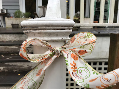 Since it was still looking like a drizzle could occur, I began my sprucing up with the most weather-proof items first, this time the outdoor ribbon. I tied bows around the 2 newel posts at the base of the deck stair railing. (You'll notice that we desperately need to paint the stair railings and stair risers.) Ribbon is a super cheap way to decorate for holidays. This is Dollar Tree ribbon purchased about 4 or 5 years ago. I keep reusing it year after year.